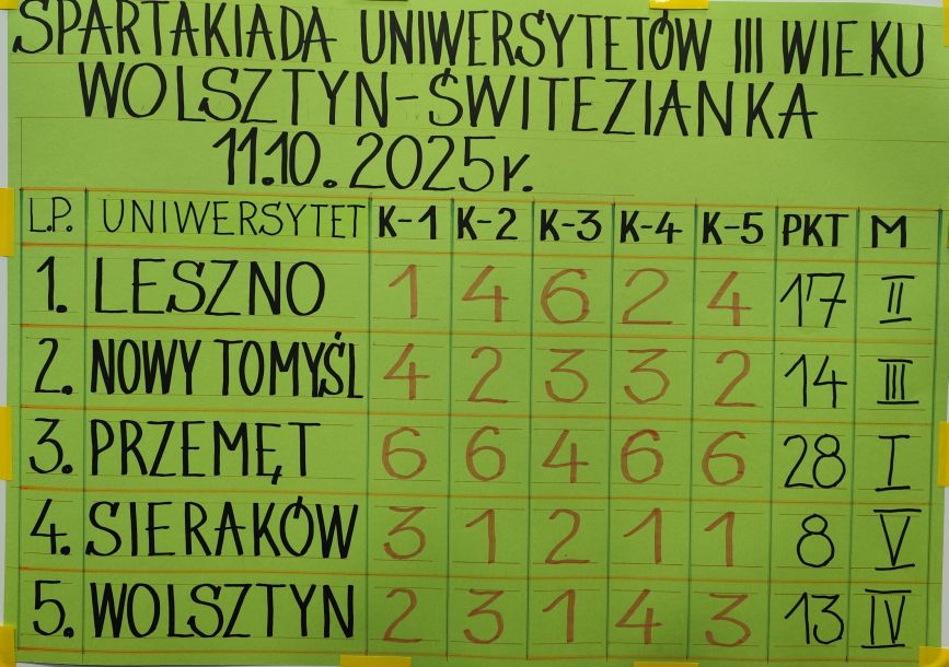 W wyniku przeprowadzonych zmagań sportowych wśród uczestników I Spartakiady Uniwersytetów III wieku, zajęte miejsca oraz punktacja przedstawia się następująco: